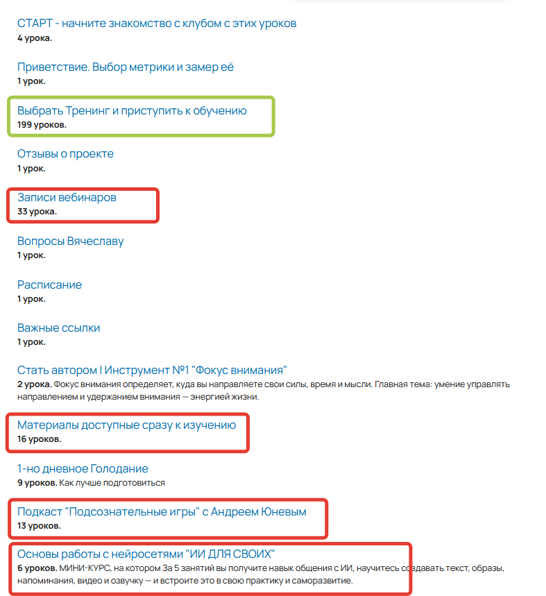 - на старте открывается доступ к любому выбранному участником тренингу по выбранной им метрике, а так же доступ к тренингу, который изучается на данный момент с ведущим всеми желающими участниками клуба.