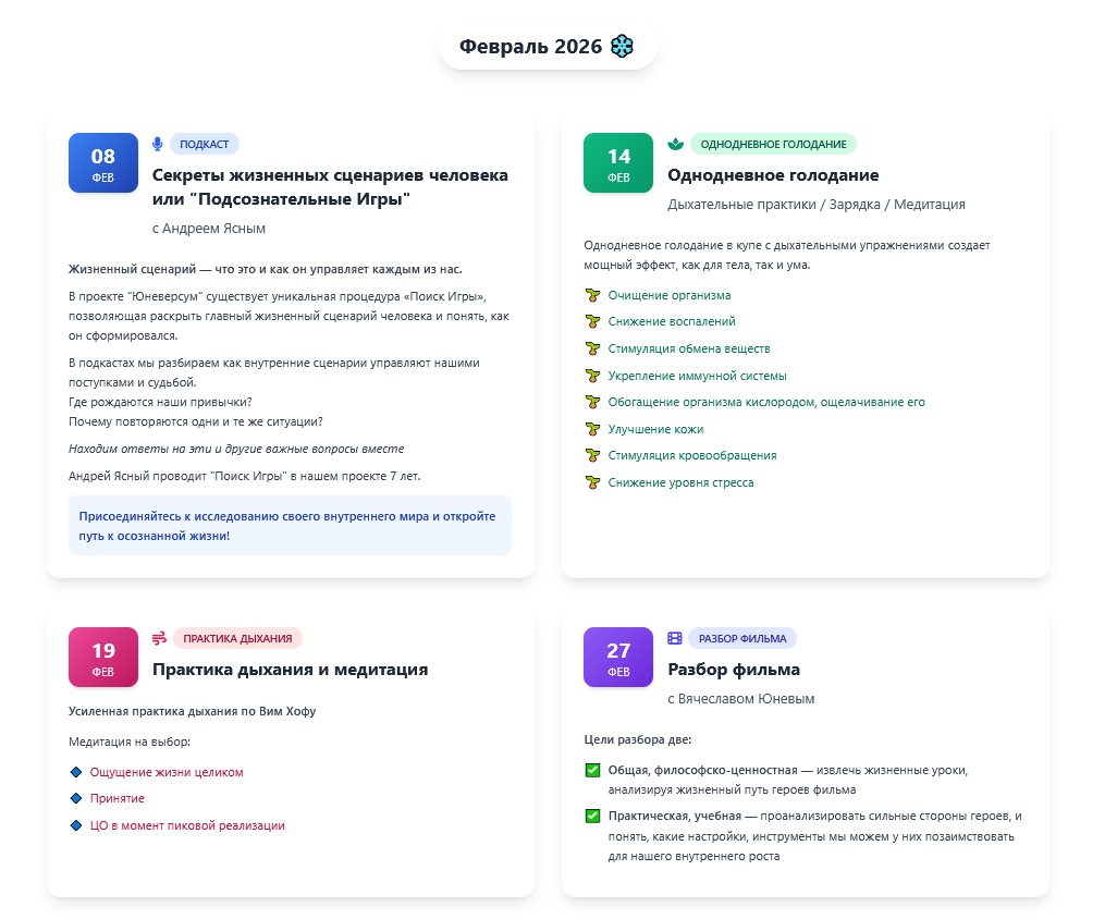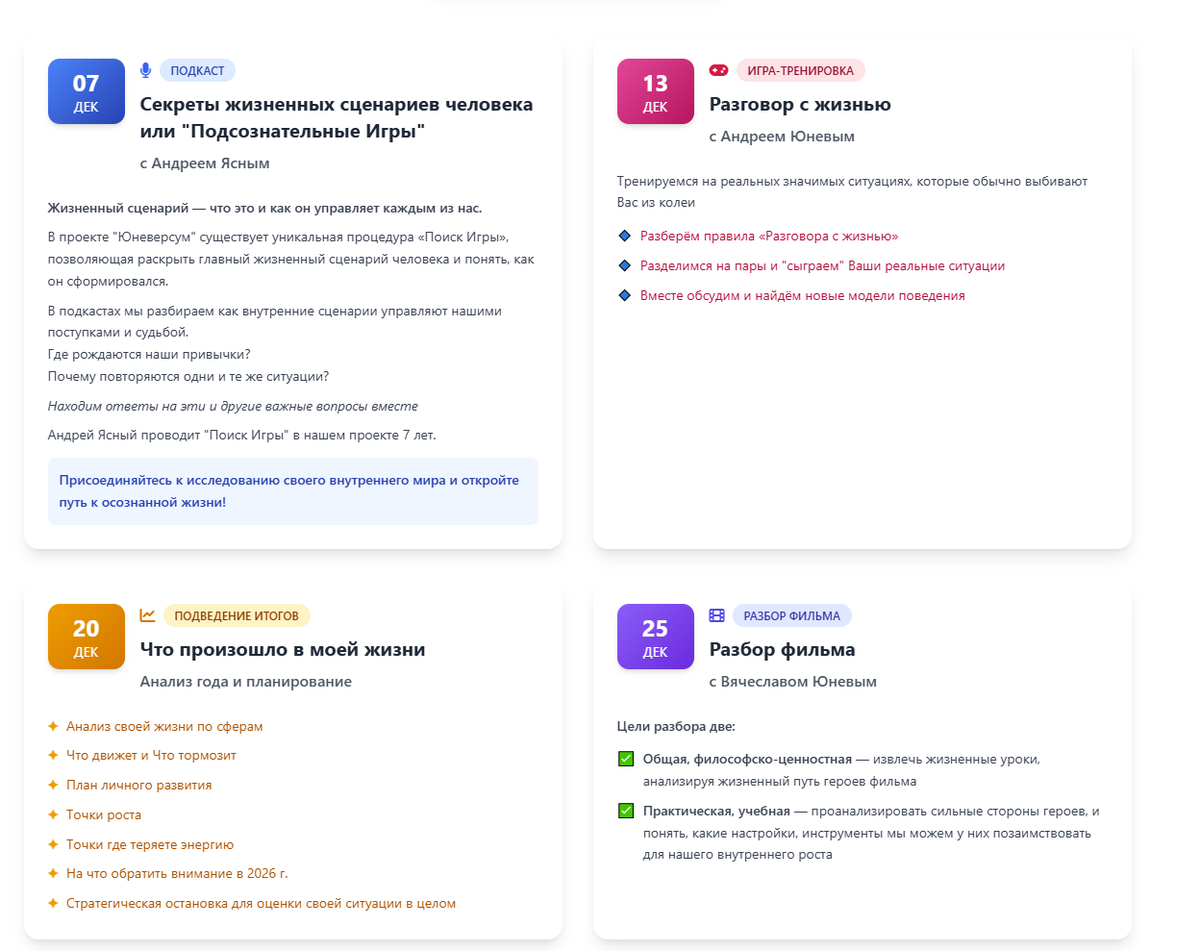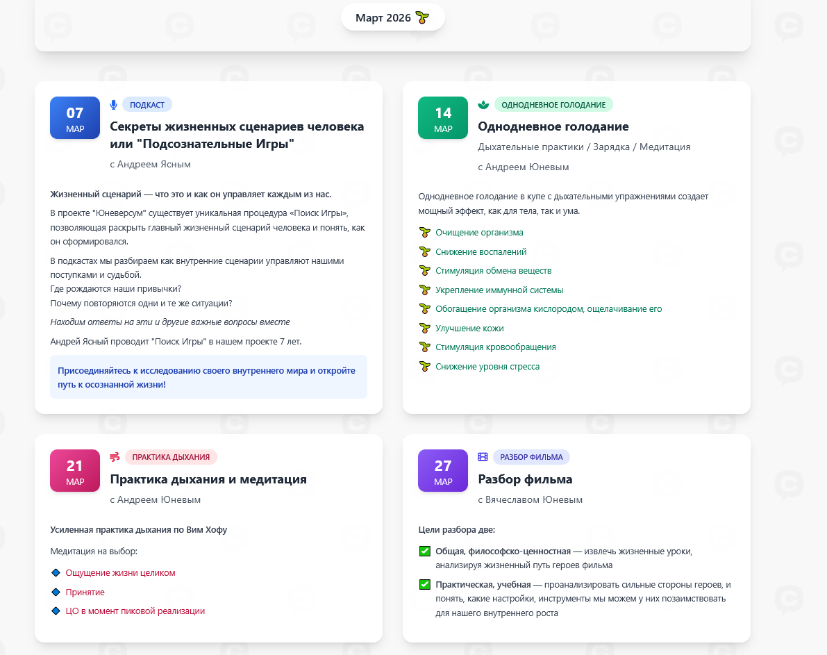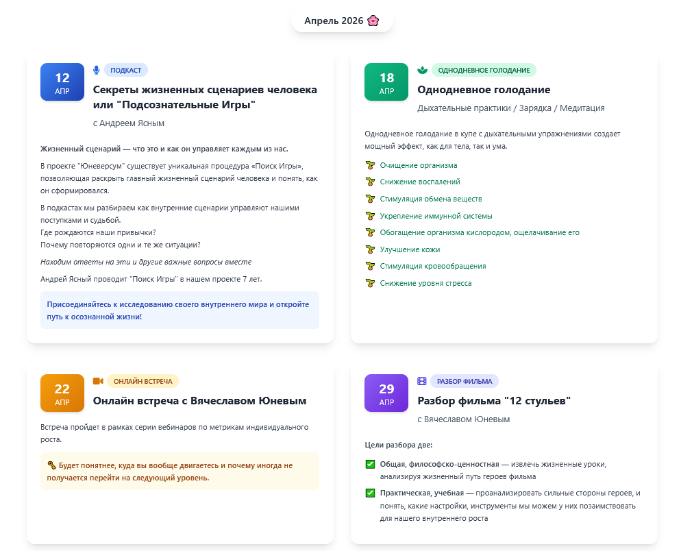 - идея клуба в том, чтобы сделать личностный рост более управляемым: выбираем конкретное направление роста на старте и получаем варианты маршрутов по материалам Юневерсума, а дополнительные мероприятия и активности помогают оставаться в энергии изменений.